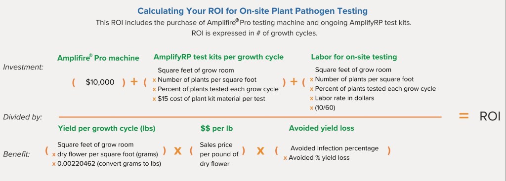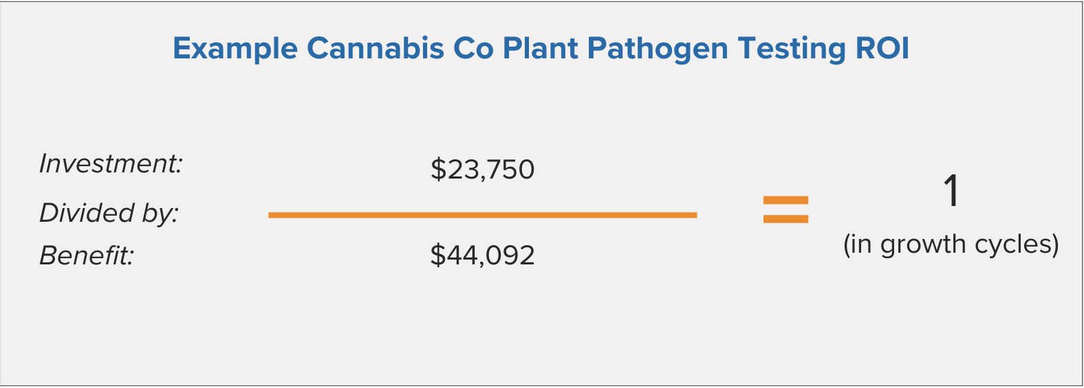 To calculate ROI, we take the investment divided by the benefit. So, is on-site plant pathogen testing a good investment for Example Cannabis Co.?